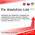 Модификатор Fix Analytics List v1.0 by Tramplin Studio исправляет баг связанный с некорректным отображением списка модулей в разгделе расширений "Аналитика" (или "Ситистика") в версиях OpenCart/ocStore 2.2 и 2.3.