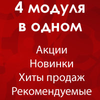 Выводит четыре товарных модуля (Рекомендуемые, Акции, Хиты продаж, Новинки) в вигде Тилив или Панели одном модуле или нескольких модулях каждый на одной страниэто.